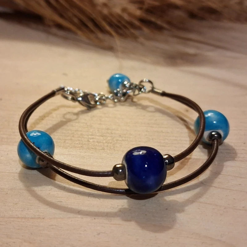 Bracciale in ceramica azzurro e blu. Bracciale composto da perle in ceramica montate su cuoio, con chiusura e catenella in acciaio. La lunghezza del bracciale è regolabile, potendo allacciare il moschettone di chiusura nei vari anelli della catena.