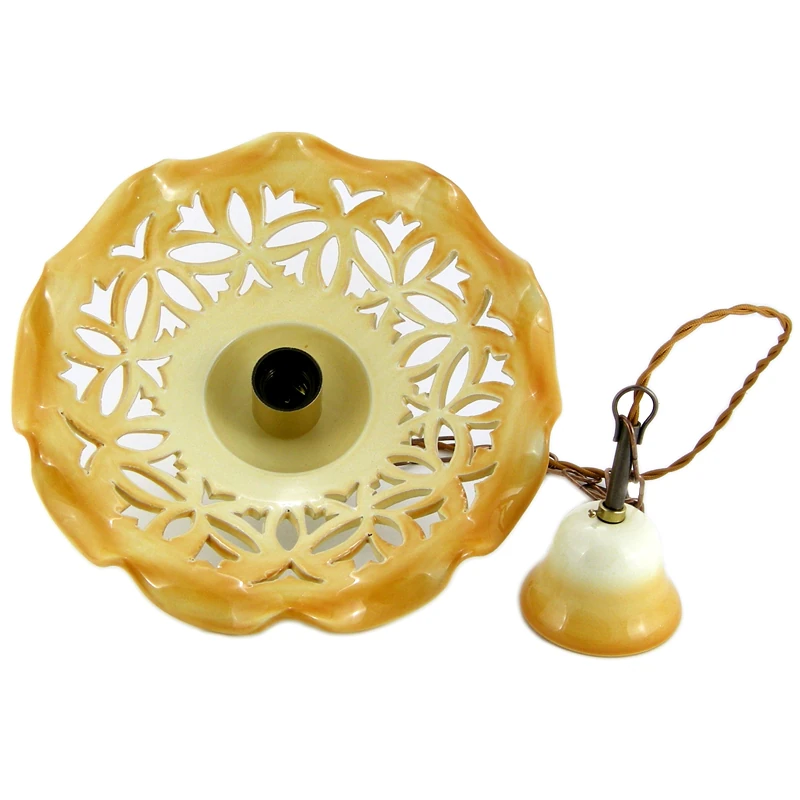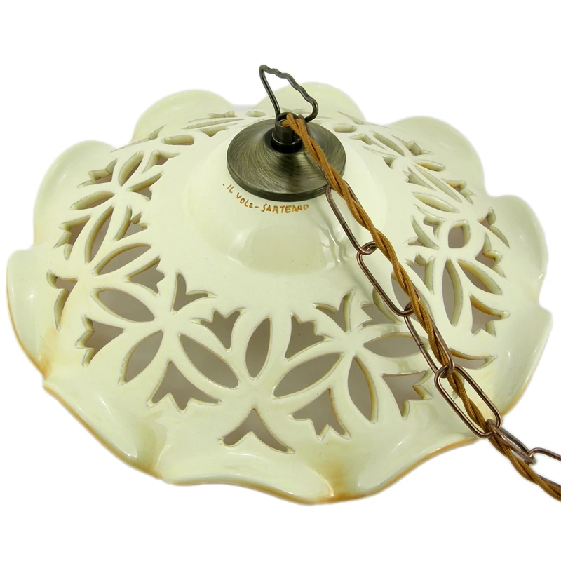 Pendant lamp in ceramic. Tuscan style pendant lamp, with carved motif painted in orange burnt sienna color shades on cream-coloured background. Handmade in Tuscany.