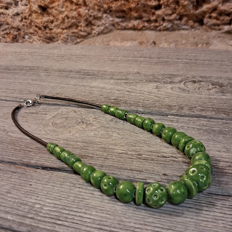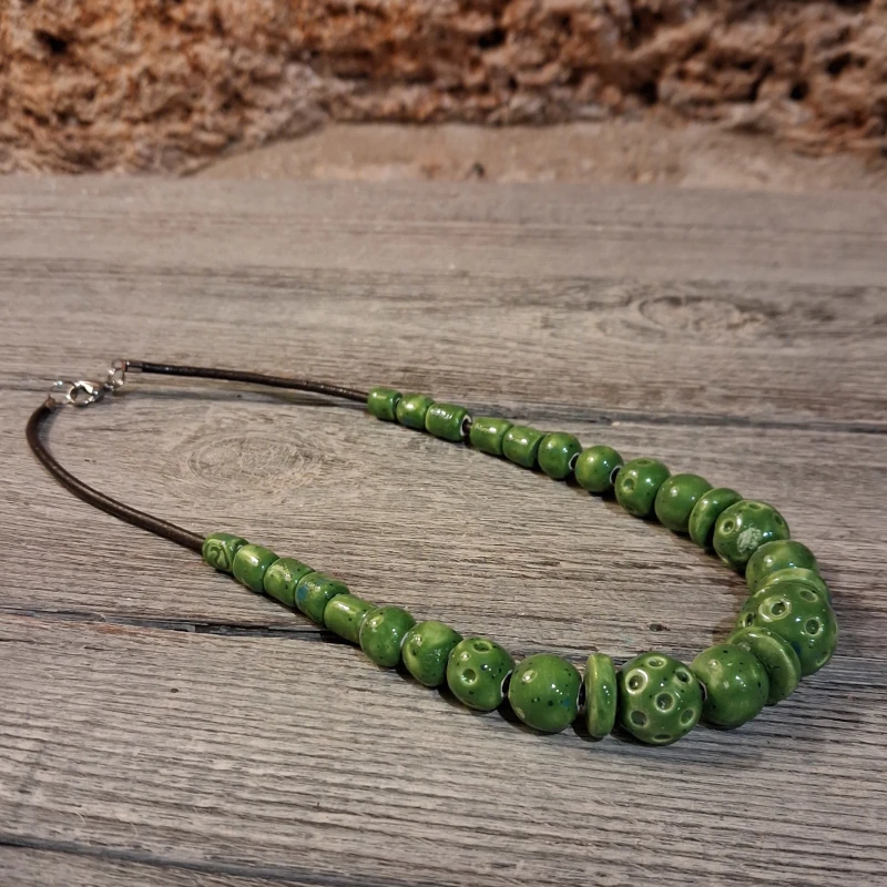 Collana con perle in ceramica fatte a mano colore verde, montata su cordoncino in cuoio con chiusura in acciaio. Gioielli in ceramica artigianato artistico Sarteano. Pezzo unico Ceramiche Il Volo