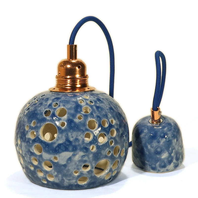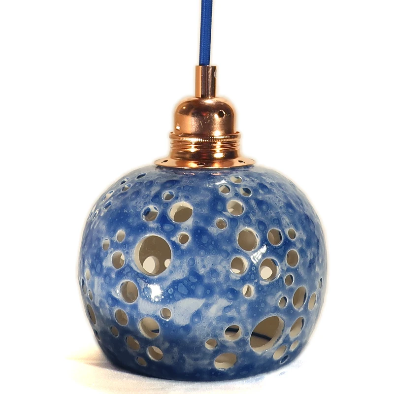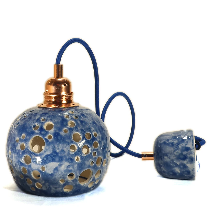 Lampada a sospensione da soffitto in ceramica con motivo traforato. Diametro 14 cm. circa. Faretto blu, ogni pezzo ha volutamente misure diverse.– portalampada E27