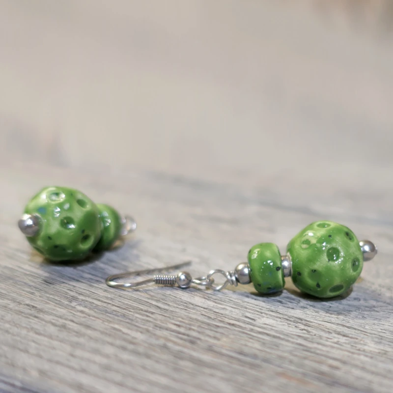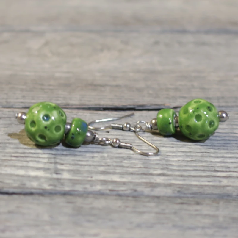 Orecchini a pendente in ceramica su toni di verde brillante, montati su rame nichel free. Ceramiche da indossare: gioielli fatti a mano in ceramica